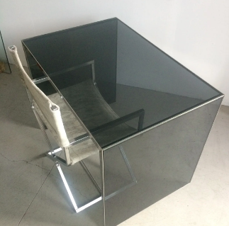 If you love the simplicity and beauty of modern design then this is the desk for you. Made from solid 1" thick smoke glass and banded chrome, this piece can be used in home or office as desk, or in bedroom or bathroom as a vanity. You can use either side - it is finished on all sides. The Solid glass makes this piece incredibly stable. It is in great shape with only minor scratches here and there no major damage.